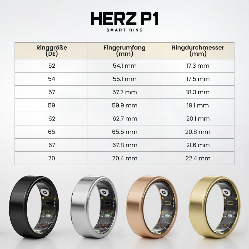 Behalten Sie Ihr Wohlbefinden rund um die Uhr im Blick mit dem Herz P1 Smart Ring – einem eleganten, langlebigen Gerät aus raumfahrttauglichem Edelstahl. Für ganztägigen Tragekomfort entwickelt, liefert er präzise Messungen Ihrer Herzfrequenz, Aktivität und Ihres Stressniveaus – ganz ohne Abonnementgebühren. Tauchen Sie über die kostenlose App, die sowohl mit iOS als auch Android kompatibel ist, in Ihr persönliches Gesundheits-Dashboard ein. Mit einer beeindruckenden Akkulaufzeit von bis zu 6 Tagen und einer 5ATM-Wasserdichtigkeit bis zu 50 Metern ist dieser Ring dafür gemacht, mit Ihnen Schritt zu halten – egal wohin das Leben Sie führt.